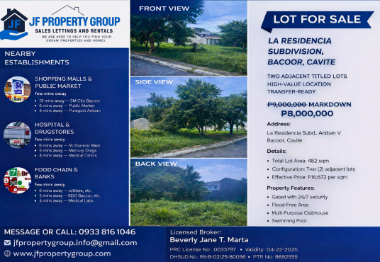 LOT FOR SALE – PRIME LOCATION IN BACOOR, CAVITE Looking for a high-value investment or future home site? This is your opportunity to own a premium property in a fast-developing area! 📍 La Residencia Subdivision, Aniban V, Bacoor, Cavite PROPERTY HIGHLIGHTS: ✔ Two (2) Adjacent Titled Lots ✔ Total Lot Area: 482 sqm ✔ Transfer-Ready […]